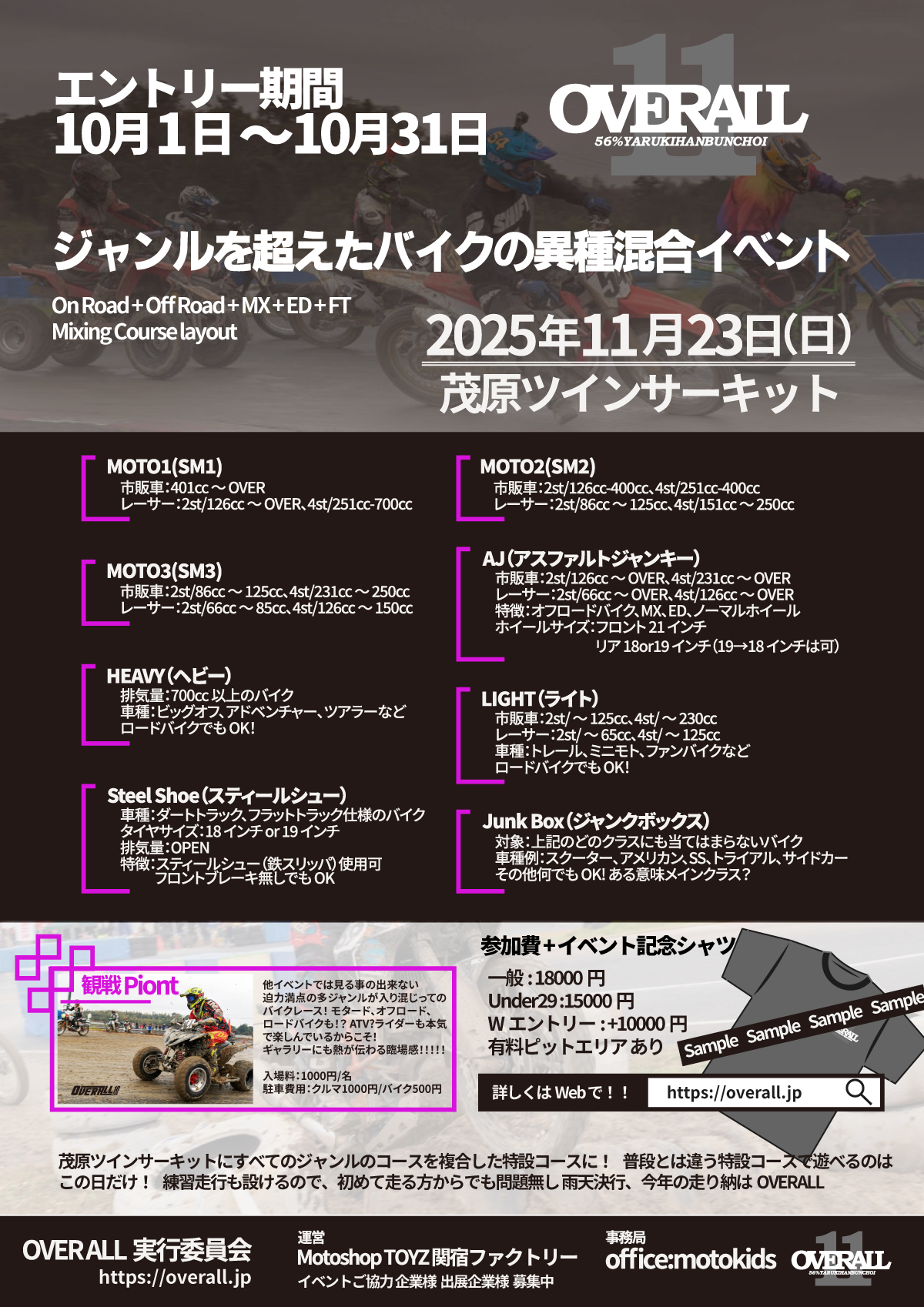 OVERALL11 10月1日からエントリー開始!! 未分類 2025.09.18 11月23日に茂原ツインサーキットで行われる、「 OVERALL 」10月1日からついにエントリーが開始されます!詳細の情報は順次更新されてまいりますので、SNSやホームページをご確認ください今回更新されているのはクラスエントリーはこちら(エントリーはまだできません)の2ページとなっております。 ポスターをダウンロード 2025OVERALL-FLY003ダウンロード